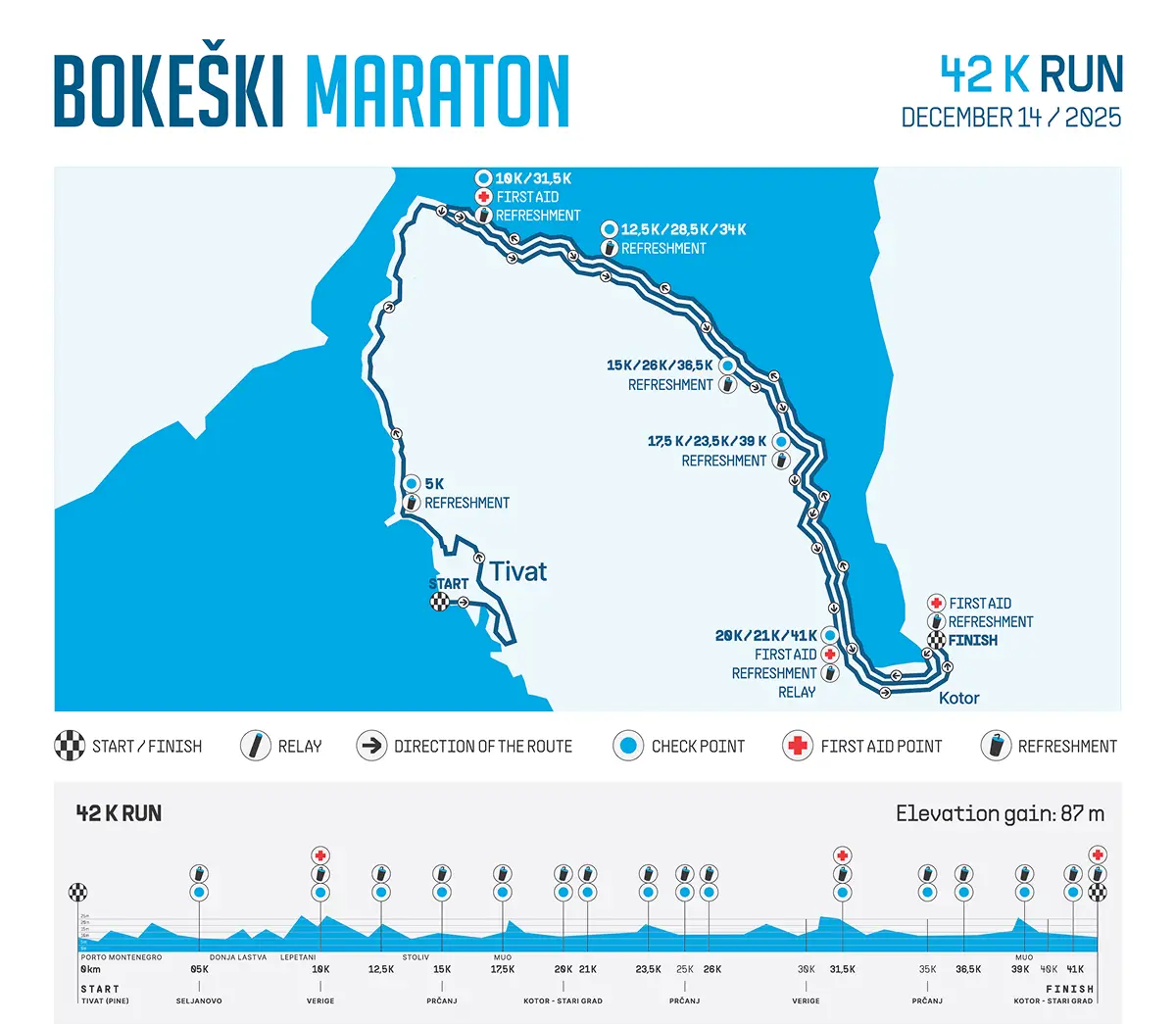 Staza: START TIVAT Pine – Obala Maršala Tita – 21. Novembra – Kalimanjska – Jadranska magistrala – Sportska hala Župa OKRET – Omladinskih radnih brigada – Veliki gradski park – Istarska – Arsenalska – Porto Montenegro – Šetalište Seljanovo – Donja Lastva Obala – Jadranska magistrala – Opatovo – Lepetani – Verige – Stoliv – Prčanj – Muo – OKRET KRUŽNI TOK – Muo – Prčanj – Stoliv – Verige – OKRET – Stoliv – Prčanj – Muo –